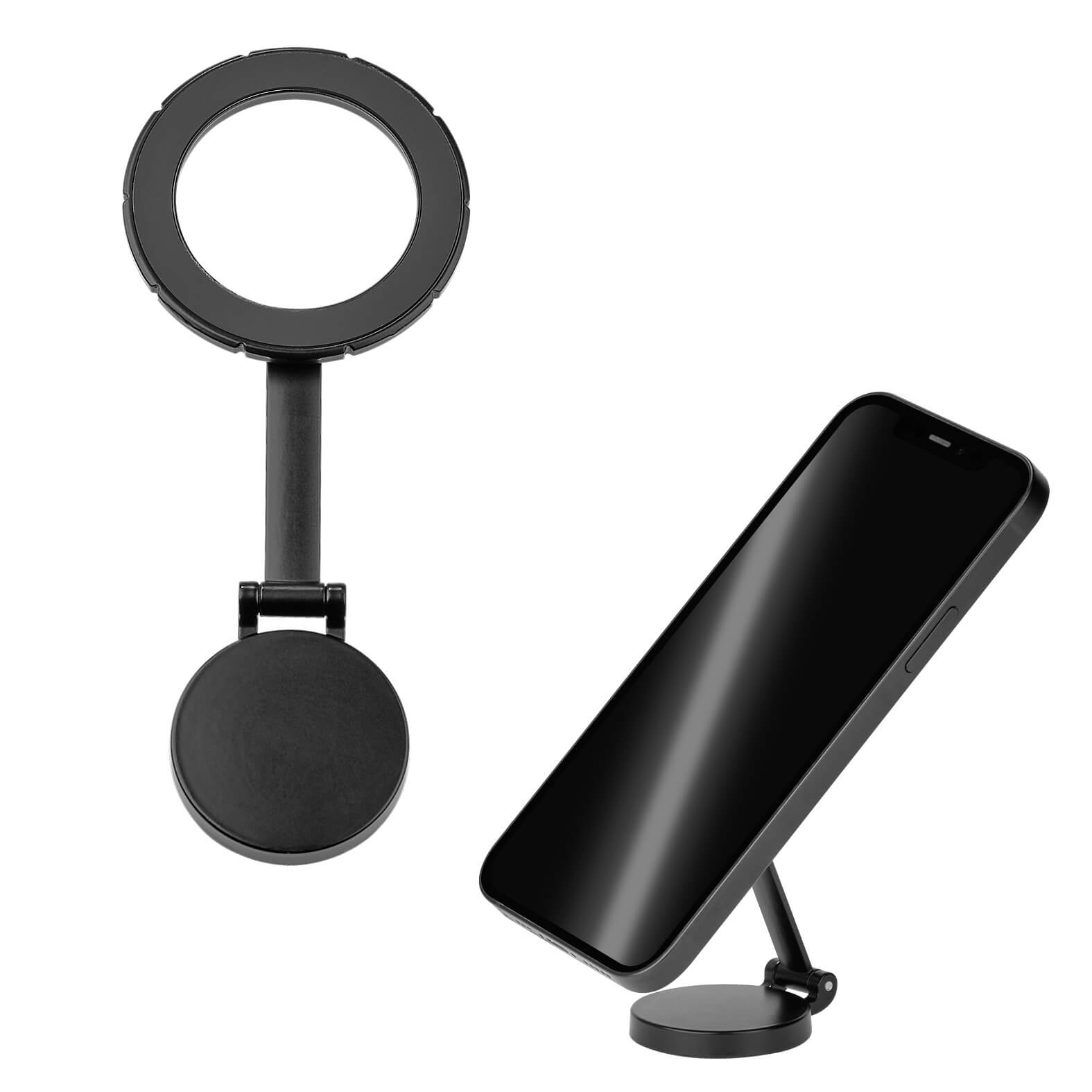 Soporte magnético metálico plegable, cuenta con base giratoria 360° y pegamento. Incluye aro magnético.